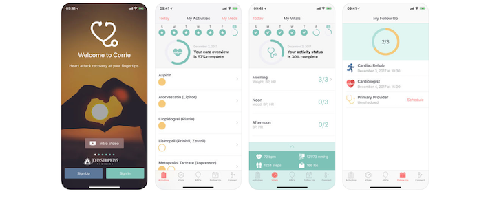Corrie, an application developed by Johns Hopkins and built on Apple’s CareKit platform, was designed to help patients navigate their life with cardiac disease post-discharge. It contains information and tracking programs to encourage healthier heart habits, provides recovery resources, and crunches analytics on biometric data gleaned from Apple Watch and a Bluetooth blood pressure monitor.
